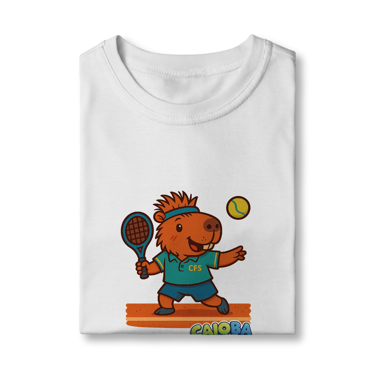A estampa exclusiva traz uma capivara jogando tênis, com roupa esportiva e muito carisma, em uma arte colorida, divertida e cheia de movimento. A impressão com Silk Digital HD oferece alta definição, cores vibrantes e excelente durabilidade.