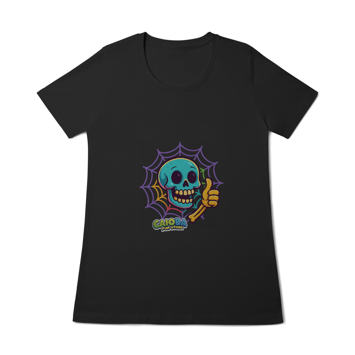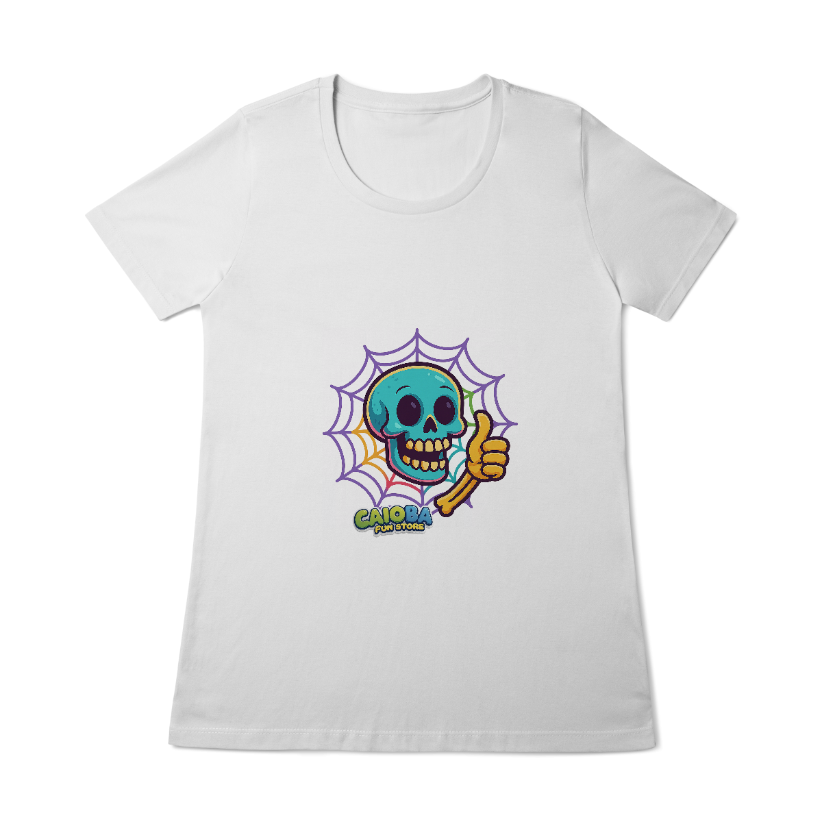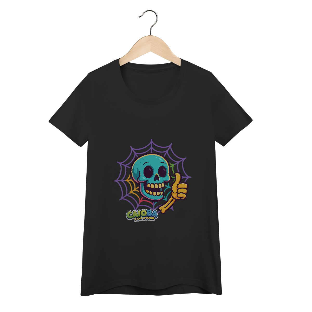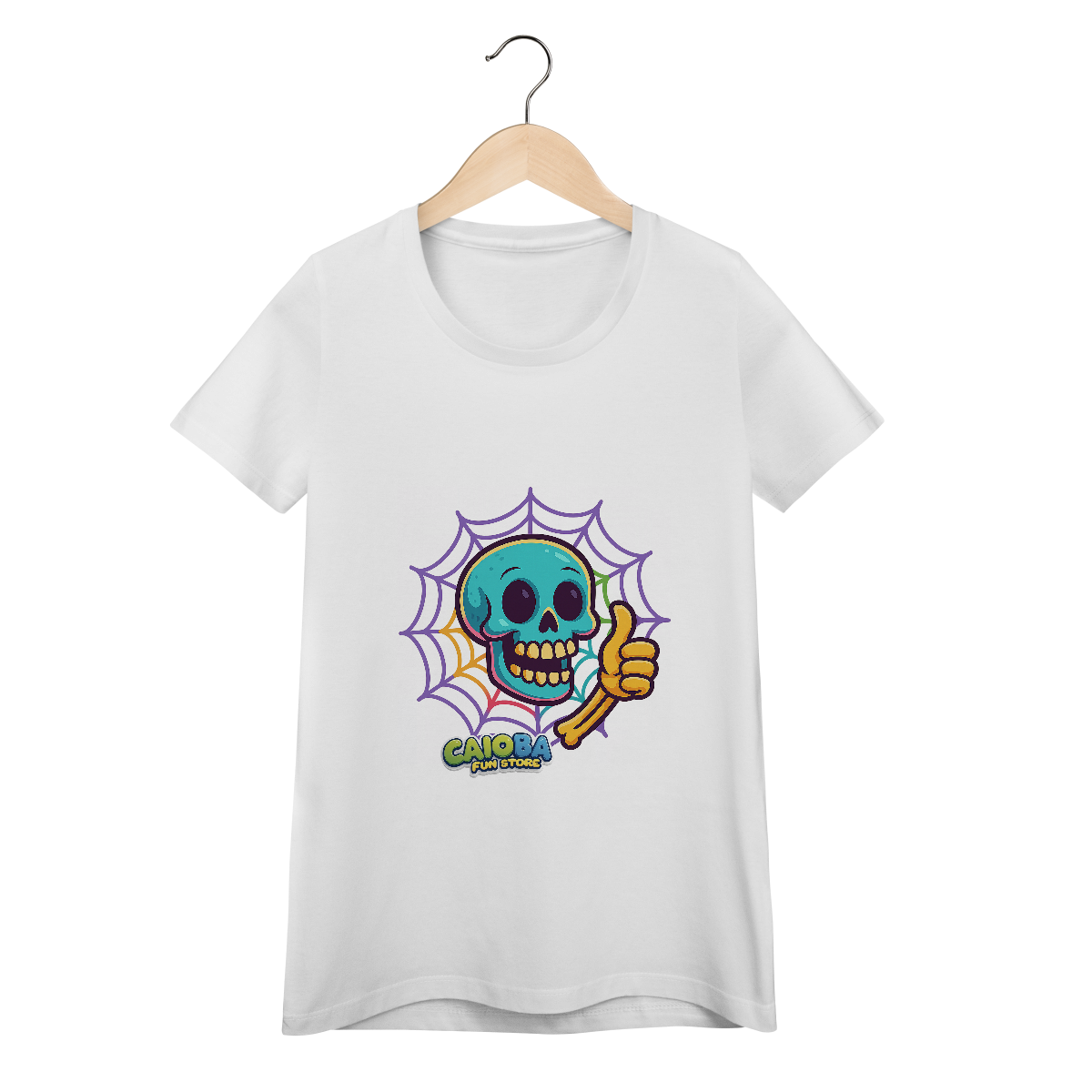 Entre no clima do Halloween com muito estilo e bom humor usando a camiseta adulto com estampa de caveira divertida da coleção Halloween do Caioba! A estampa exclusiva traz uma caveira colorida sorrindo e fazendo joinha, cercada por uma teia de aranha, em um visual irreverente e criativo que combina com o espírito leve e divertido da data.