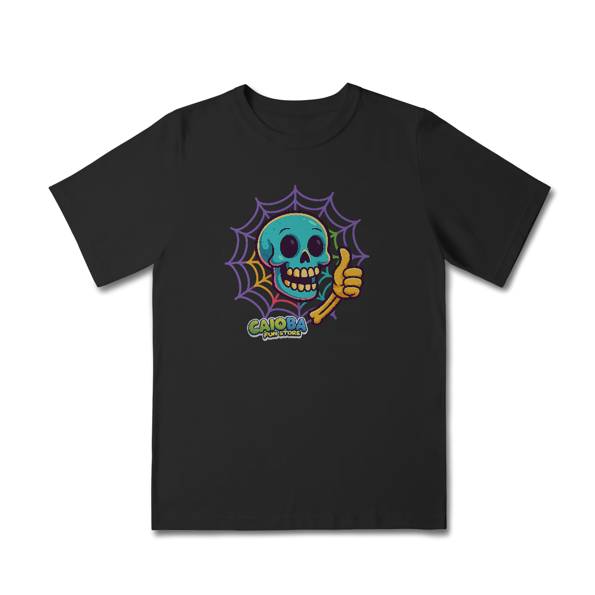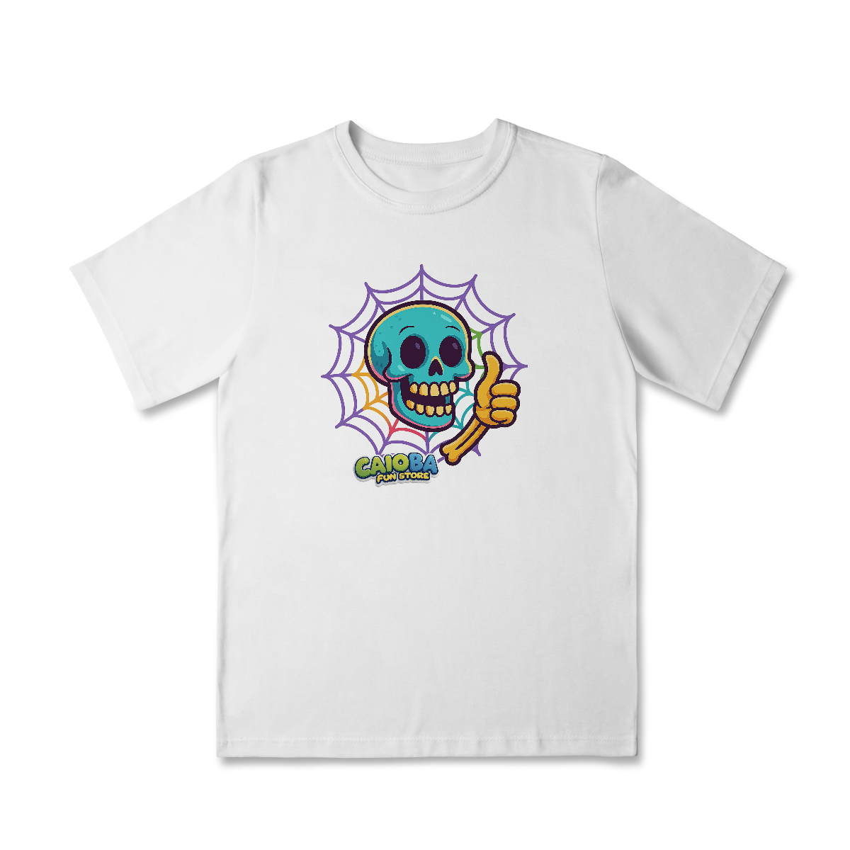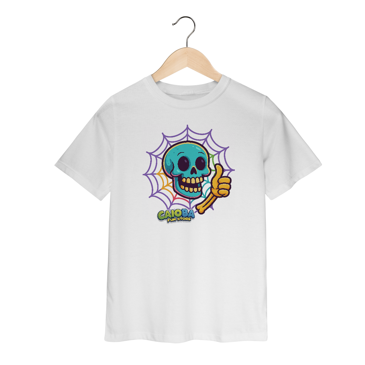 Deixe o Halloween ainda mais divertido com a camiseta infantil com estampa de caveira colorida da Caioba Fun Store! Perfeita para meninos e meninas, essa camiseta temática é ideal para o Dia das Bruxas ou para looks criativos o ano todo. A estampa exclusiva traz uma caveira sorridente fazendo joinha, com detalhes em cores vibrantes e uma divertida teia de aranha, tudo com um toque alegre e nada assustador.