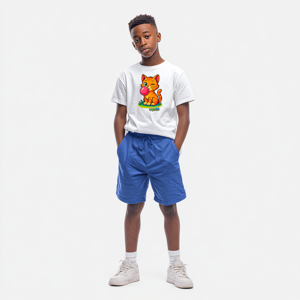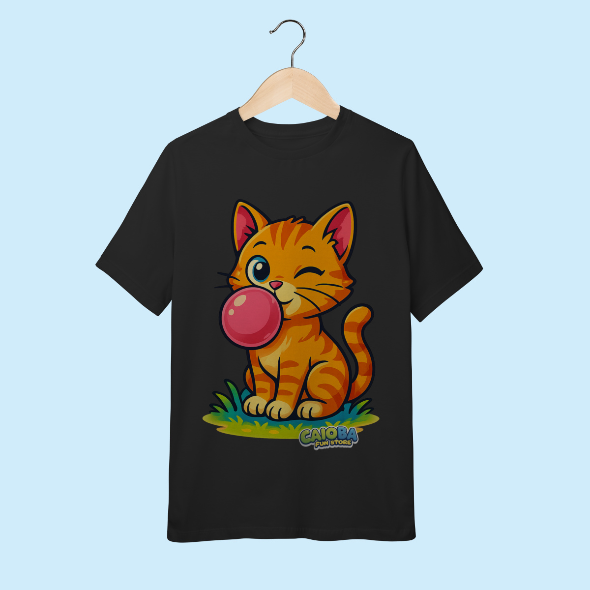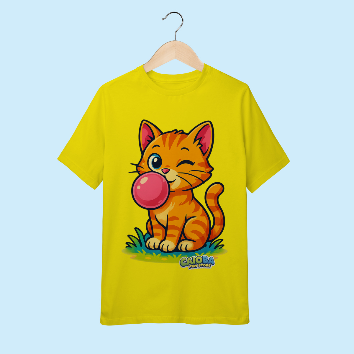 A estampa exclusiva traz um gato amarelo simpático e cheio de personalidade, desenvolvida a partir das ideias criativas de uma criança de 7 anos. Impressa com a moderna tecnologia Silk Digital HD, garante cores vibrantes, traços nítidos e alta durabilidade, mesmo após várias lavagens.