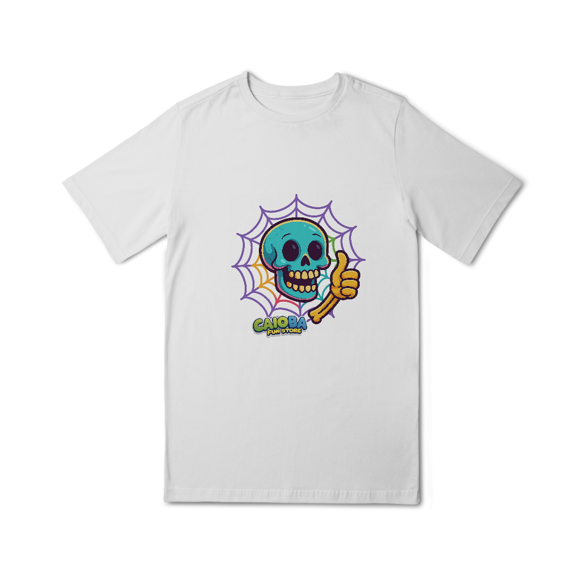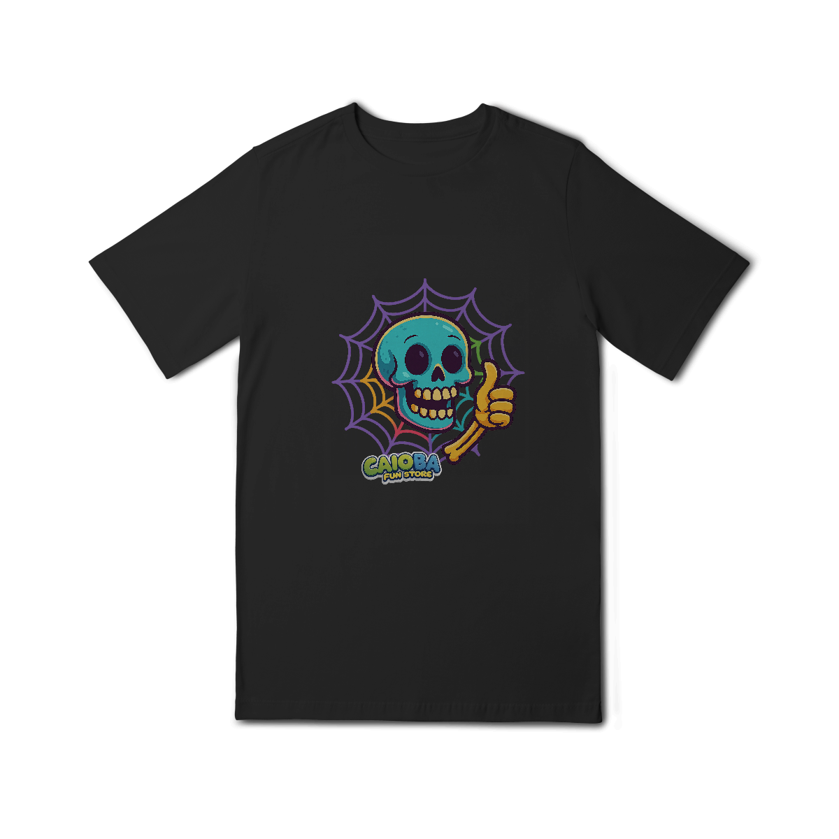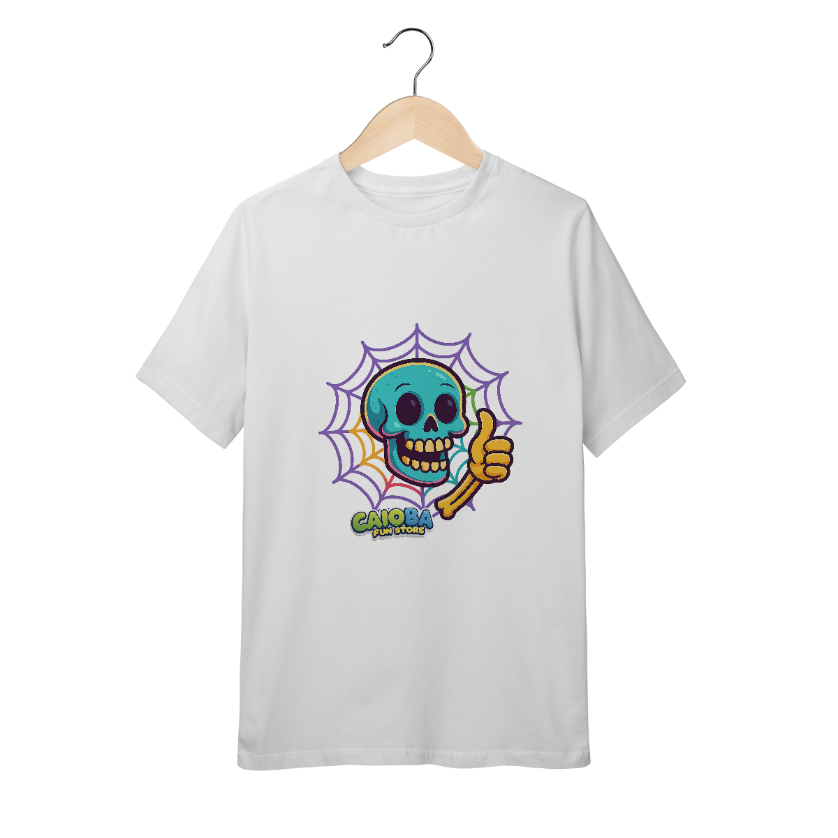 Deixe o Halloween ainda mais divertido com a camiseta infantil com estampa de caveira colorida da Caioba Fun Store! Perfeita para meninos e meninas, essa camiseta temática é ideal para o Dia das Bruxas ou para looks criativos o ano todo. A estampa exclusiva traz uma caveira sorridente fazendo joinha, com detalhes em cores vibrantes e uma divertida teia de aranha, tudo com um toque alegre e nada assustador.